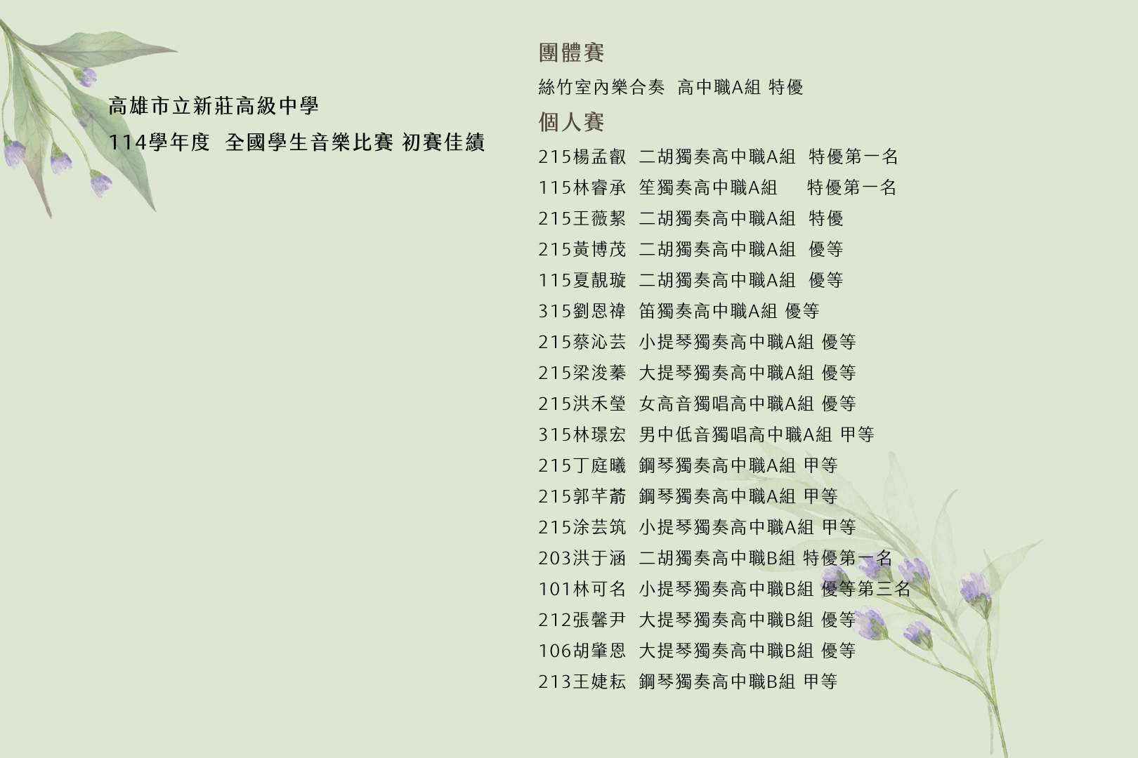 校園公告 公告主旨 【音樂競賽】[114學年度] 114學年度全國學生音樂比賽高雄市初賽成績 發佈日期 2025 年 12 月 09 日 發佈單位 音樂組 公告類別 重要消息, 新莊榮耀 公告等級 狂賀 點閱次數 105 公告內容 相關附件 【2025-12-09】「2025數位學習成果分享會」敬邀師生踴躍參與 【2025-12-09】114學年度第一學期秩序比賽成績-第十四週
