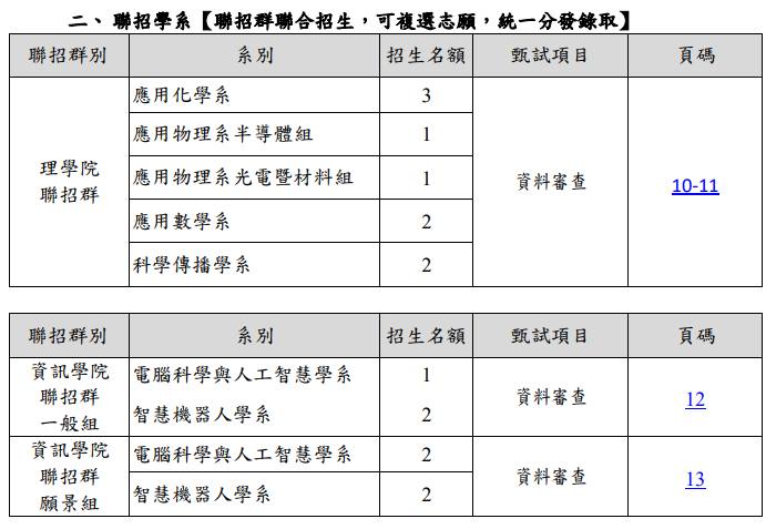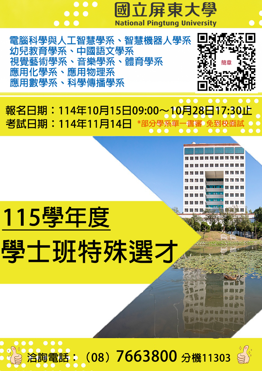 校園公告 公告主旨 國立屏東大學特殊選才招生資訊 發佈日期 2025 年 10 月 07 日 發佈單位 輔導處 公告類別 升學資訊 公告等級 無 點閱次數 31 公告內容 屏東大學特殊選才招生開始囉… 報名日期114.10.15~114.10.28 報名系統連結:https://webap.nptu.edu.tw/oess/O01/O0101SPage.aspx 簡章公告連結:https://admission.nptu.edu.tw/p/406-1005-186743,r1.php 附件提供本次招生DM及單招及聯招學系名額 有簡章上的問題可致電承辦單位(08)766-3800分機11301,林組員 相關附件 屏大特選DM 屏大特選DM 檔案名稱檔案大小檔案格式下載屏大特選DM.jpg1.01 MB新視窗開啟檔案 屏大特選DM.jpg 單招學系 單招學系 檔案名稱檔案大小檔案格式下載單招學系.jpg32.79 KB新視窗開啟檔案 單招學系.jpg 聯招學系 聯招學系 檔案名稱檔案大小檔案格式下載聯招學系.jpg45.85 KB新視窗開啟檔案 聯招學系.jpg 【2025-10-07】函轉財團法人賑災基金會樺加沙颱風之各項賑助申請事宜 【2025-10-07】財團法人淡江大學115學年度學士班特殊選才招生訊息