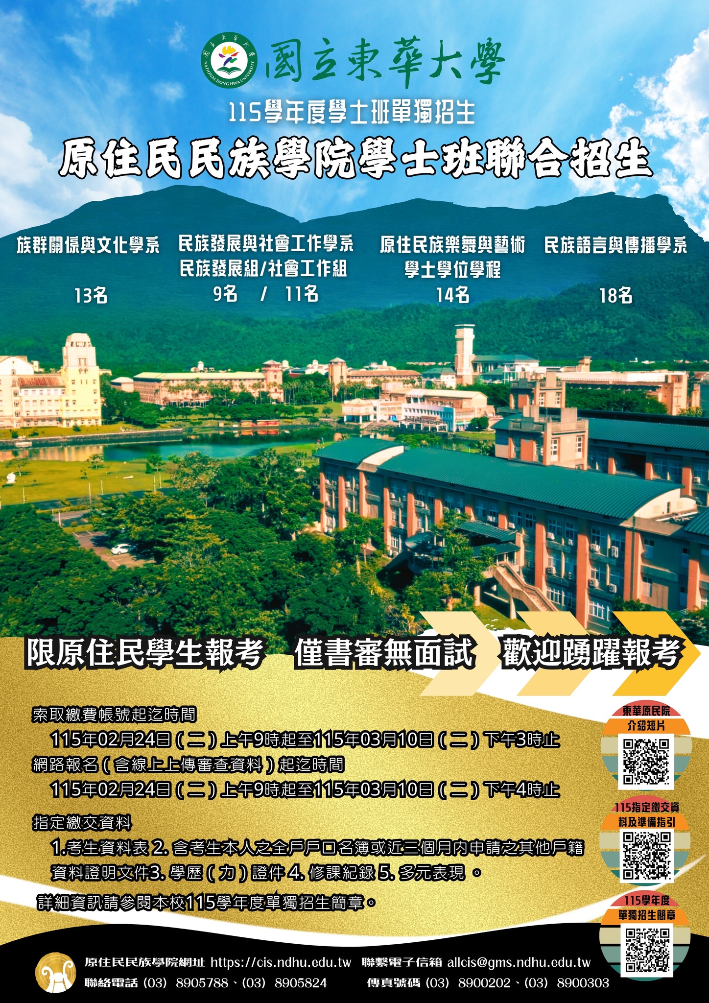 | 公告主旨 | 國立東華大學原住民族學院民族發展與社會工作學系115學年度單獨招生訊息 |