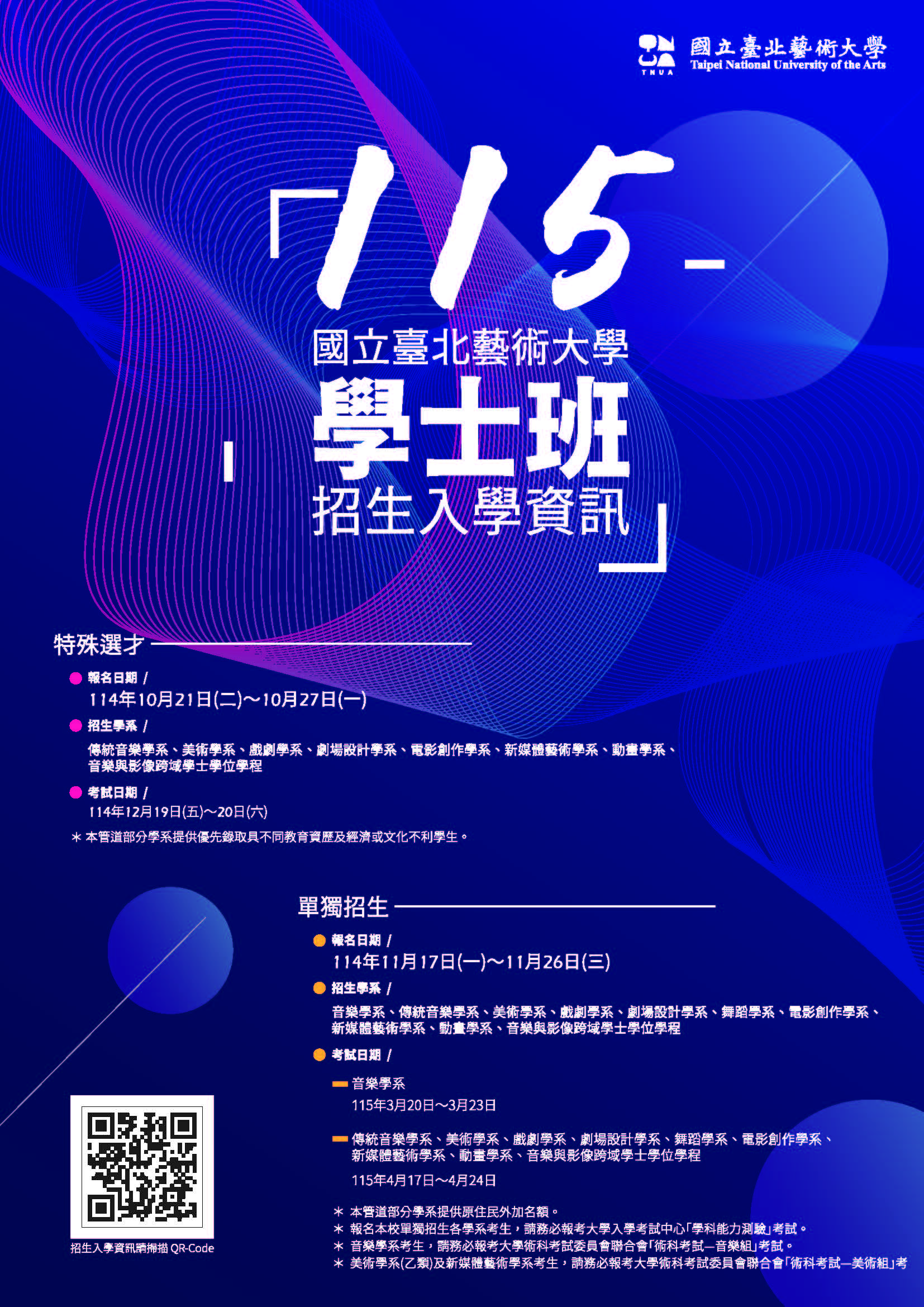 | 公告主旨 | 國立臺北藝術大學115學年度學士班單獨招生考試開始報名 |