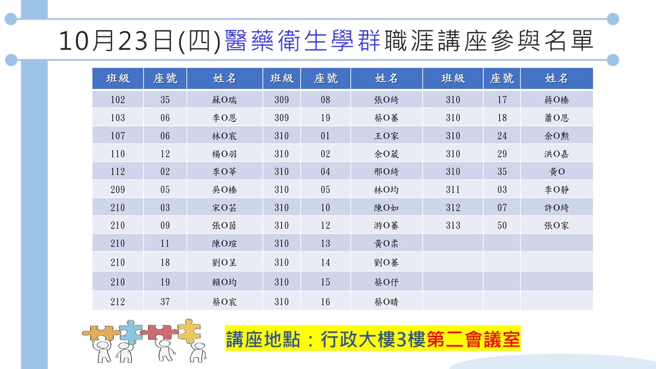 | 公告主旨 | 輔導處生涯探索活動「醫藥衛生學群」職涯講座參與名單 |