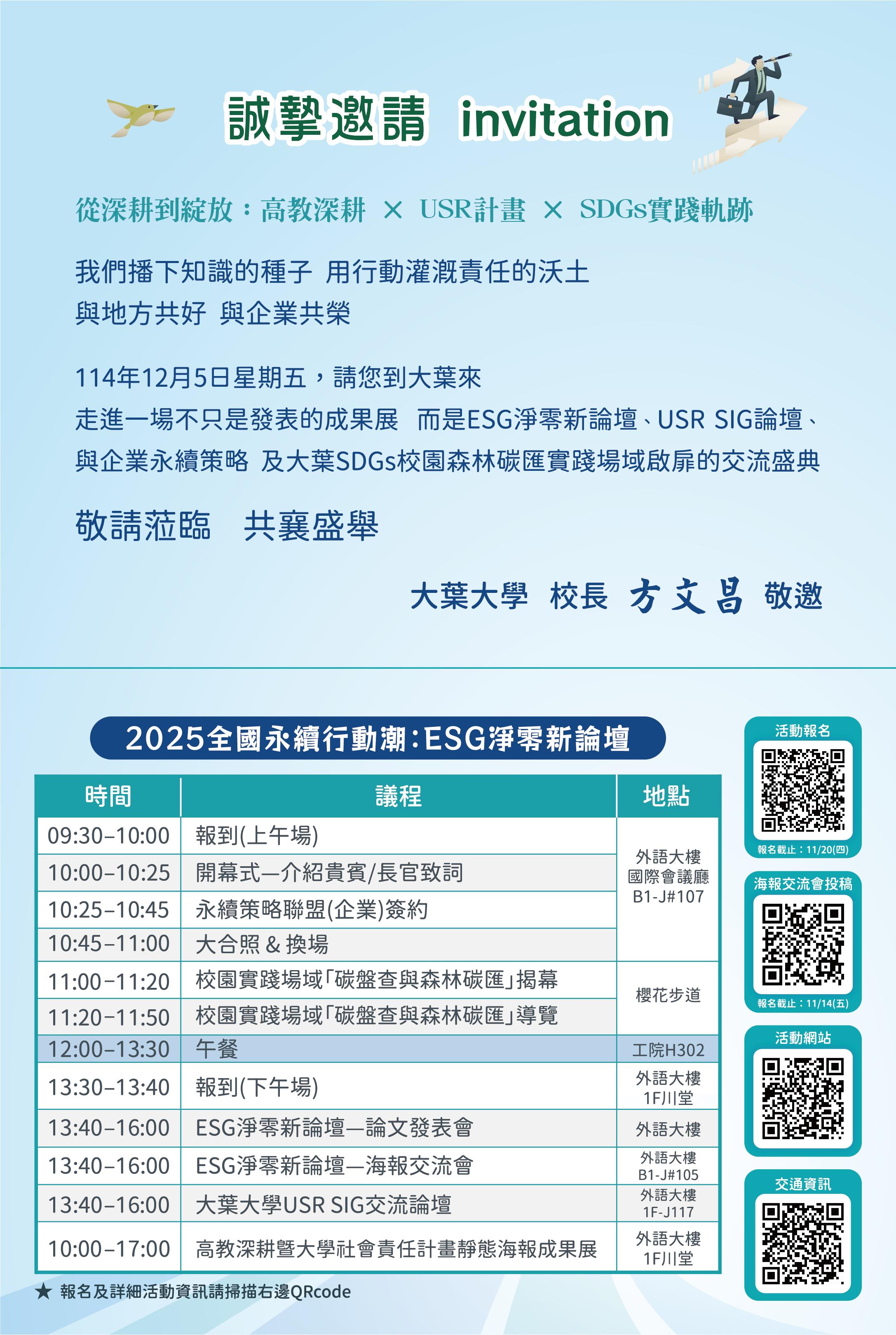 主旨:本校謹訂於114年12月5日(星期五)辦理「114年度高教深耕/USR計畫成果發表會」,並將針對「2025全國永續行動潮:ESG淨零新論壇」議題進行徵稿,敬請惠予公告相關訊息,並鼓勵師生踴躍投稿,請查照。