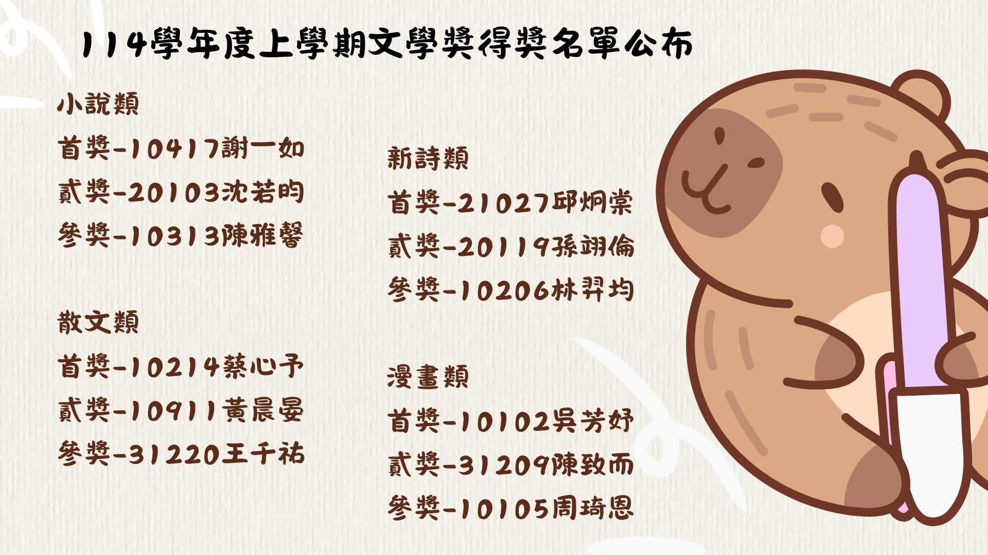 | 公告主旨 | 114學年度上學期新莊文學獎得獎名單 | ||||||||||||||||||||||||||||||||||||||||||||||||||||