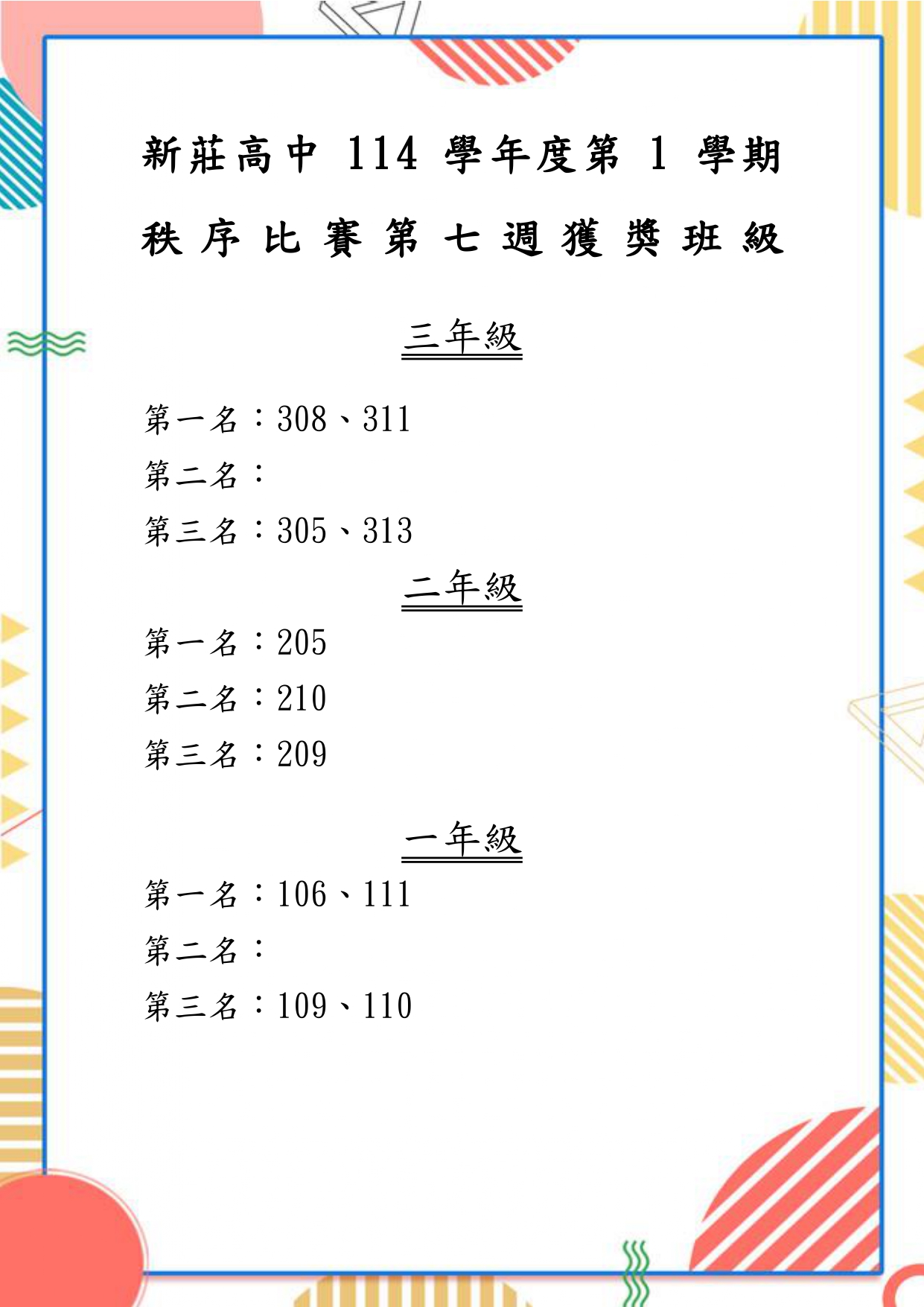 | 公告主旨 | 114學年度第一學期秩序比賽成績-第七週 |