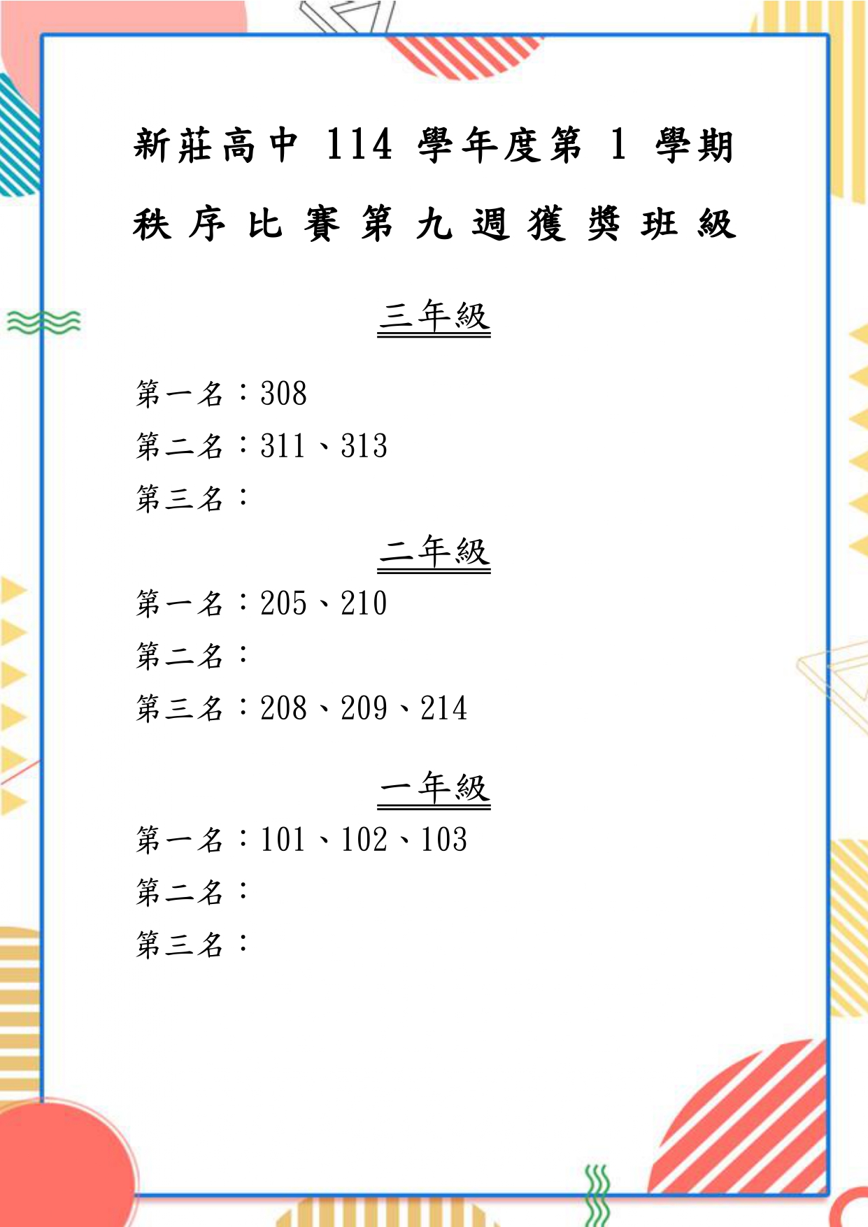 | 公告主旨 | 114學年度第一學期秩序比賽成績-第九週 |