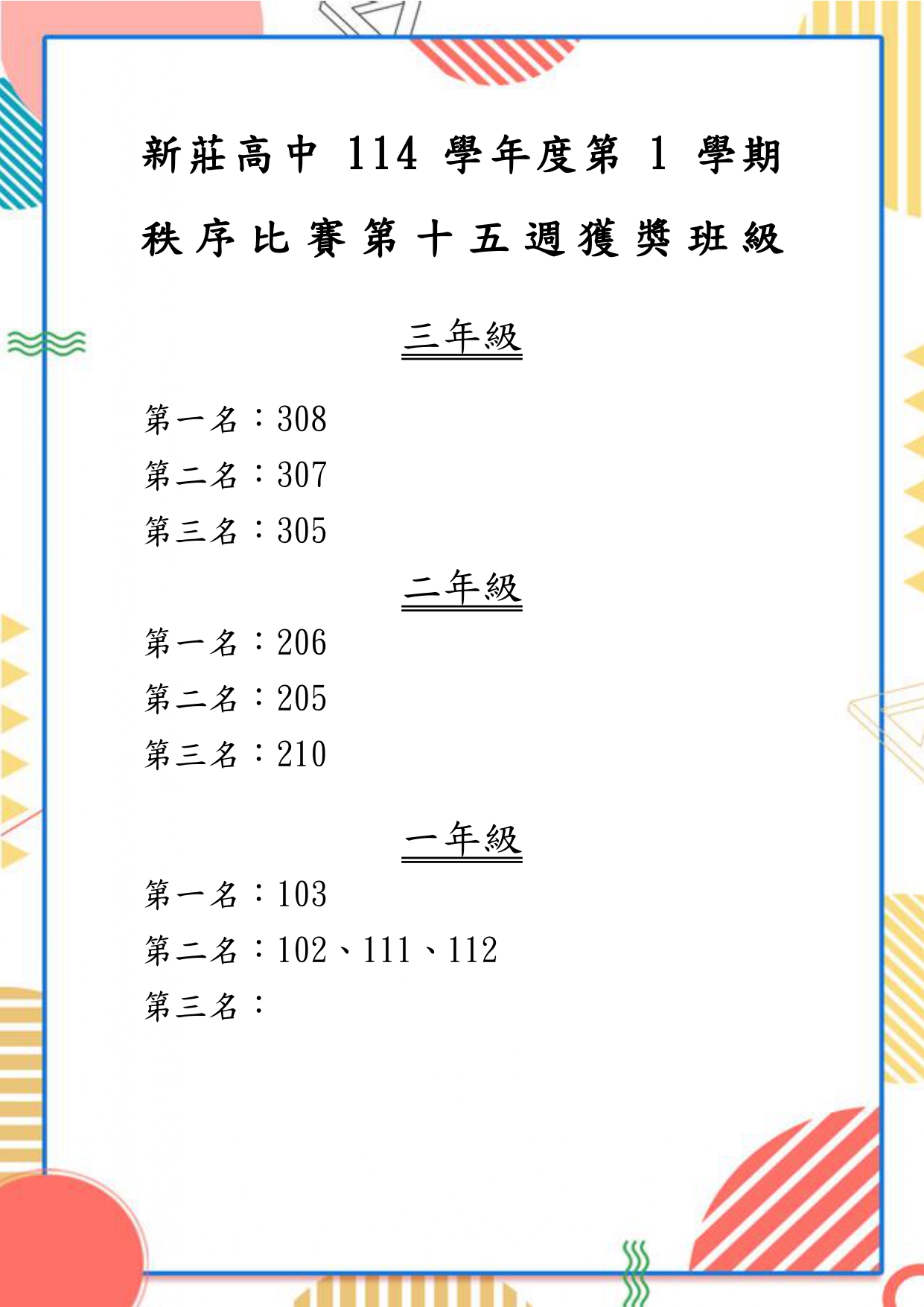 | 公告主旨 | 114學年度第一學期秩序比賽成績-第十五週 |