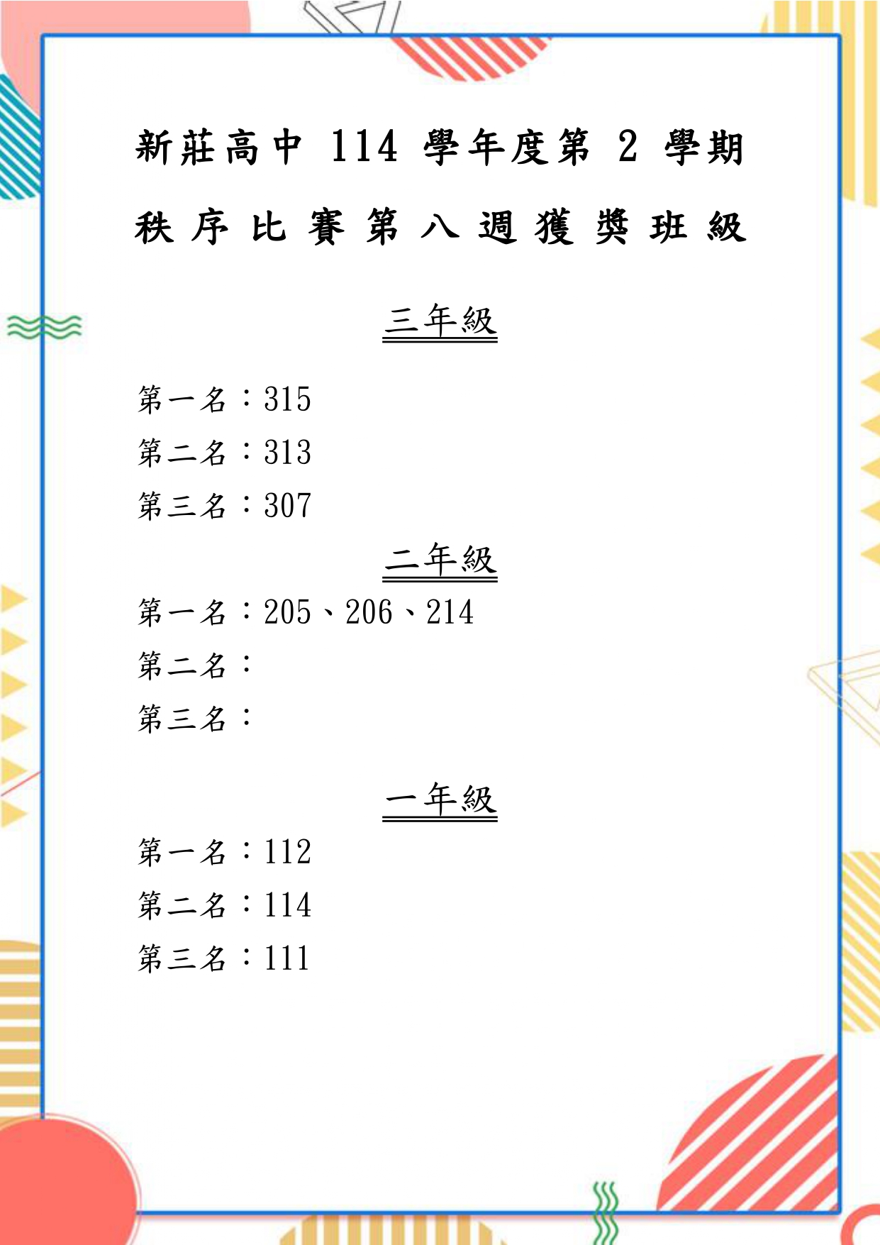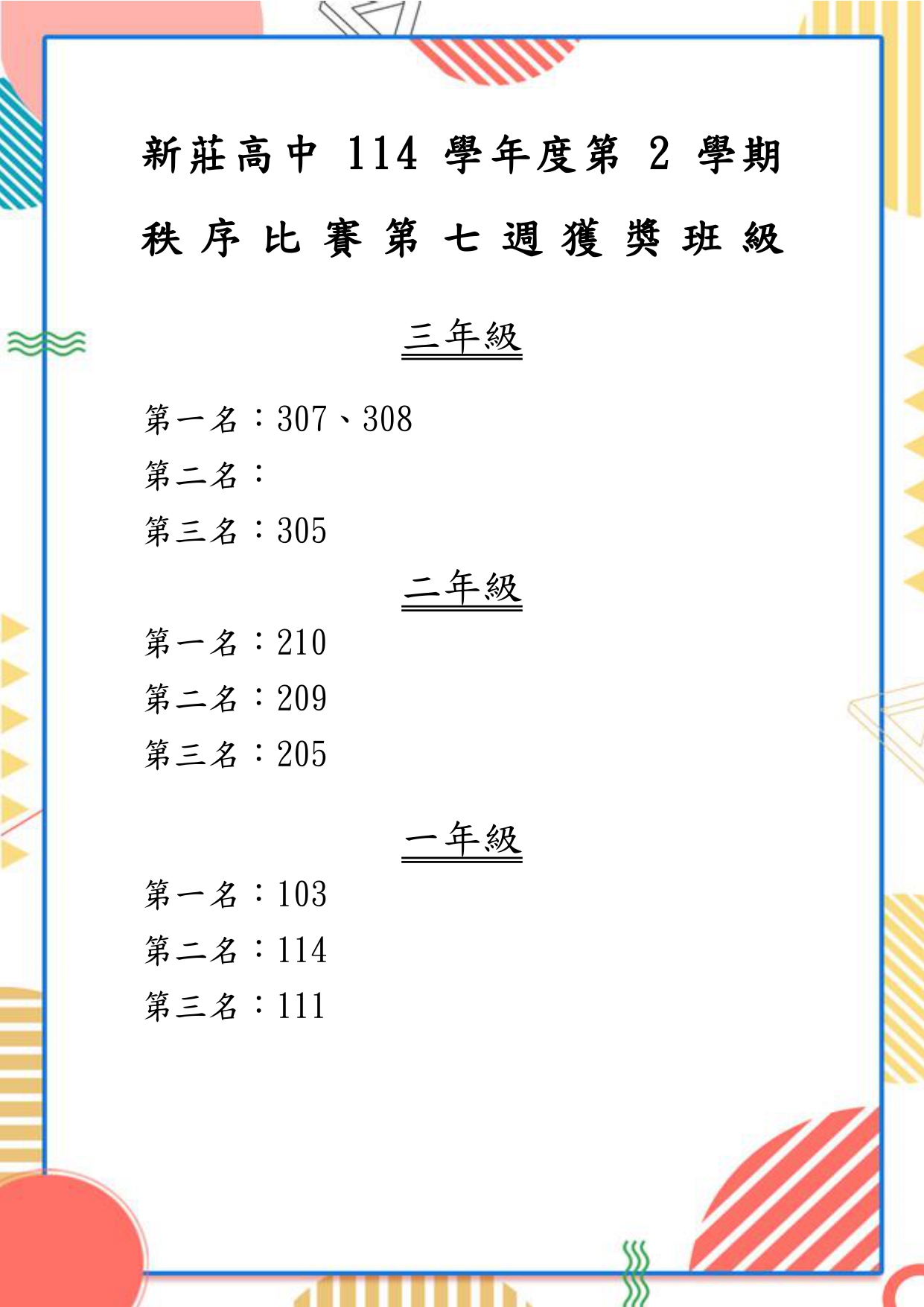 校園公告 公告主旨 114學年度第二學期秩序比賽成績-第七、八週 發佈日期 2026 年 4 月 29 日 發佈單位 生輔組 公告類別 行政公告 公告等級 無 點閱次數 25 公告內容 附檔為第七、八週秩序比賽得獎班級,感謝各班導師辛勞。 相關附件 114-2第七週秩序比賽得獎班級 114-2第七週秩序比賽得獎班級 檔案名稱檔案大小檔案格式下載114-2第七週秩序比賽得獎班級.jpg455.07 KB新視窗開啟檔案114-2第八週秩序比賽得獎班級.jpg453.10 KB新視窗開啟檔案 114-2第七週秩序比賽得獎班級.jpg114-2第八週秩序比賽得獎班級.jpg 【2026-04-29】114年農林漁牧業普查 【2026-04-29】國家太空中心檢送「Balloon Popping Challenge火箭導控軟體競賽 ...