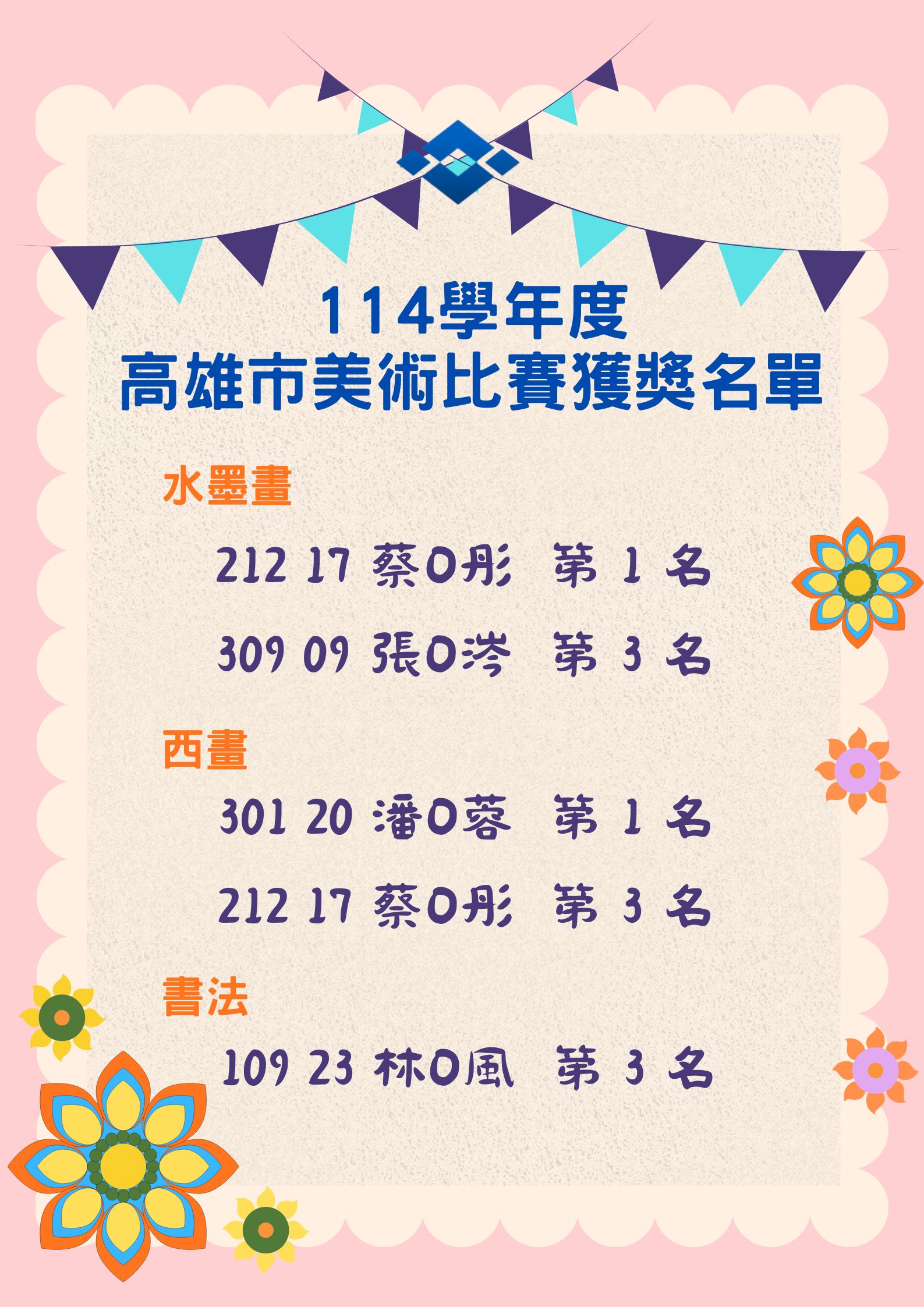 | 公告內容 | 114學年度高雄市美術比賽得獎名單如附件 |