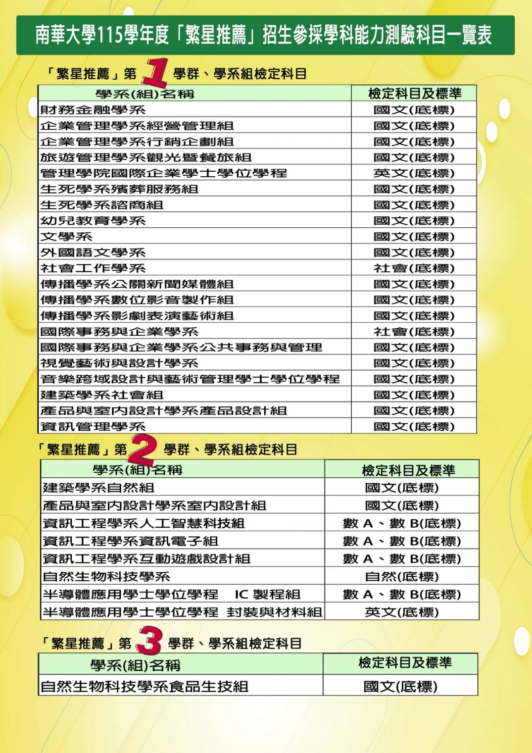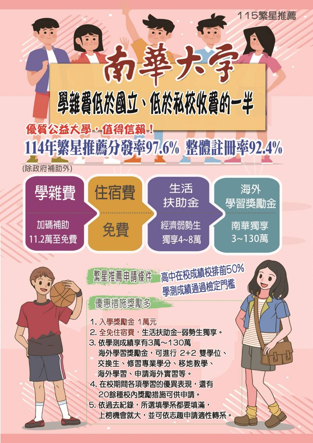 校園公告 公告主旨 115年度南華大學繁星招生資訊 發佈日期 2026 年 1 月 27 日 發佈單位 註冊組 公告類別 家長專區, 升學資訊, 來文宣導 公告等級 轉知 點閱次數 17 公告內容 115學年度南華大學繁星招生資訊,歡迎高三清寒優秀學生踴躍報名! 相關附件 【2026-01-27】本校 115 學年度大學特殊選才錄取名單(截至 1/23) 【2026-01-27】114-1補考時間表暨注意事項