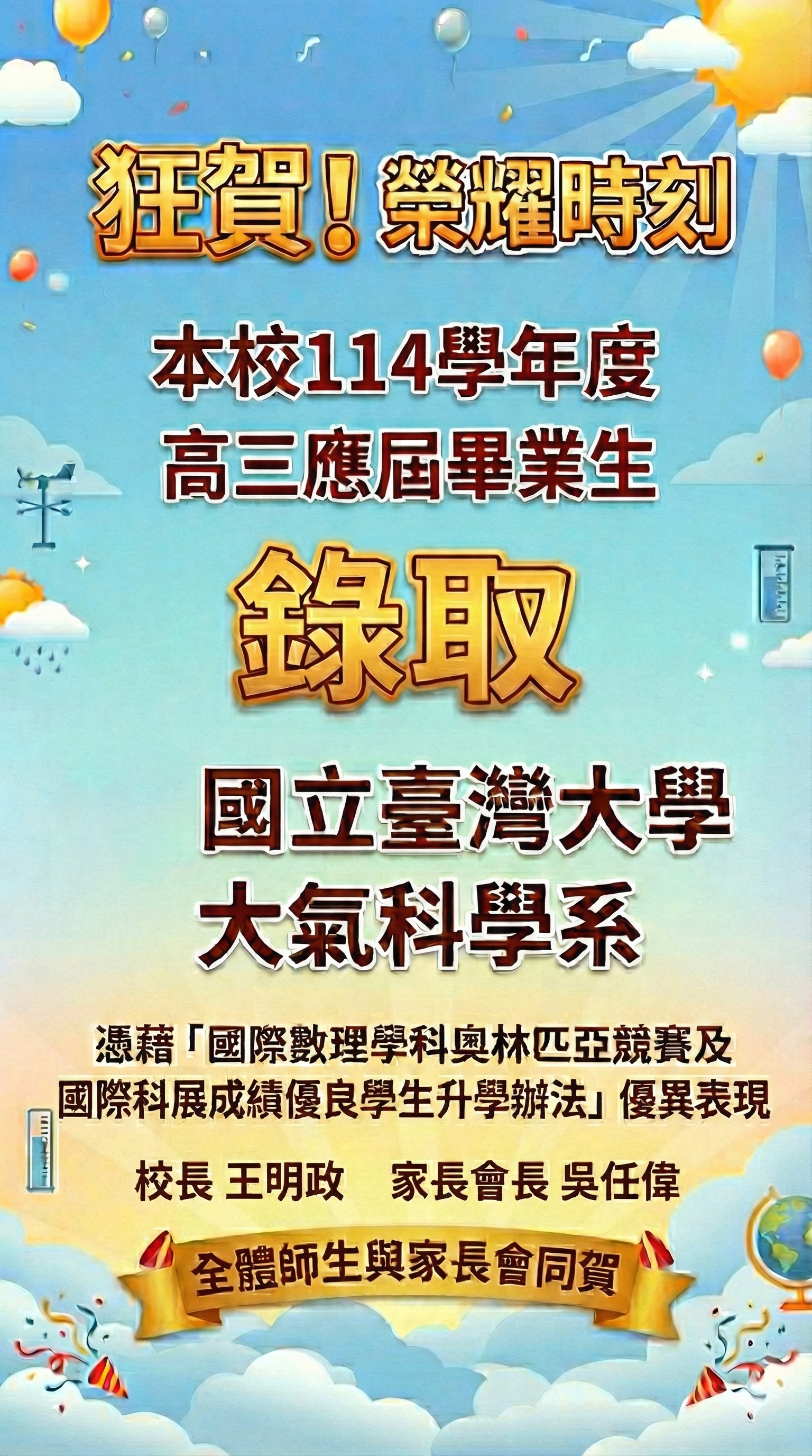 校園公告 公告主旨 115升大學榮譽榜 發佈日期 2025 年 11 月 26 日 發佈單位 註冊組 公告類別 重要消息, 新莊榮耀 公告等級 無 點閱次數 864 公告內容 恭喜高三同學上榜國立臺灣大學大氣科學系! 相關附件 【2025-11-26】114學年度校慶園遊會整潔比賽辦法及環保獎勵要點 【2025-11-26】114學年度校慶運動會秩序冊