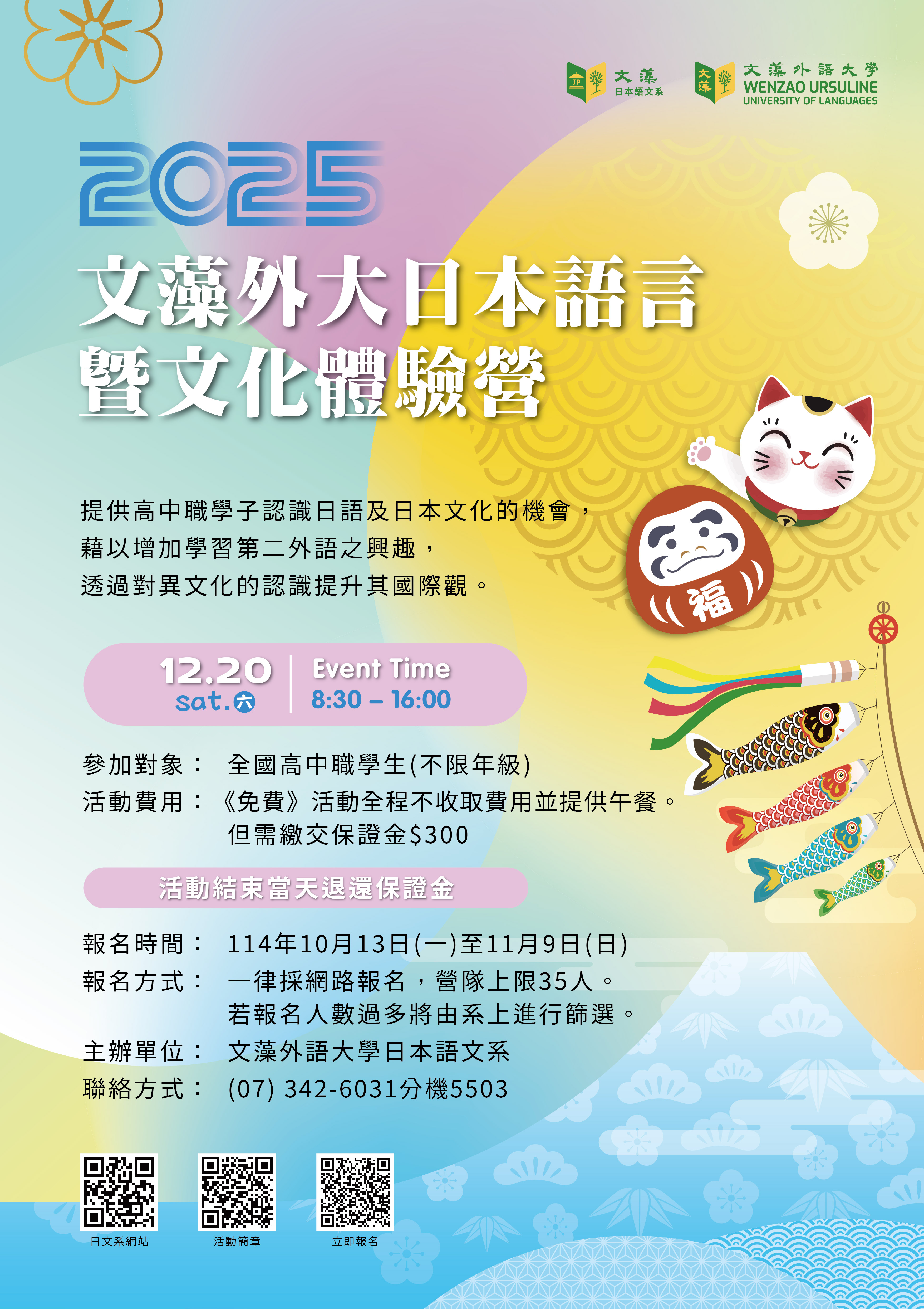 | 公告主旨 | 2025冬季文藻外大日本語言暨文化體驗營 |
