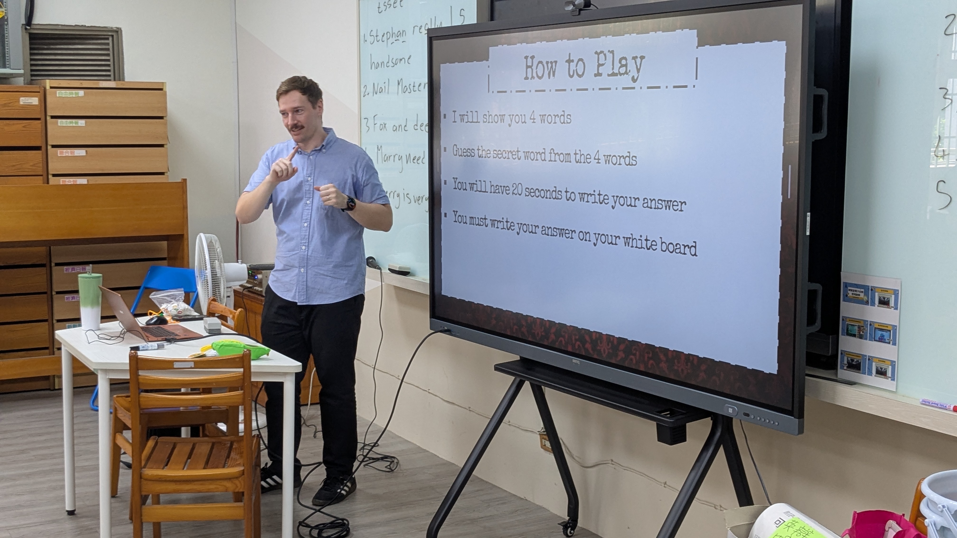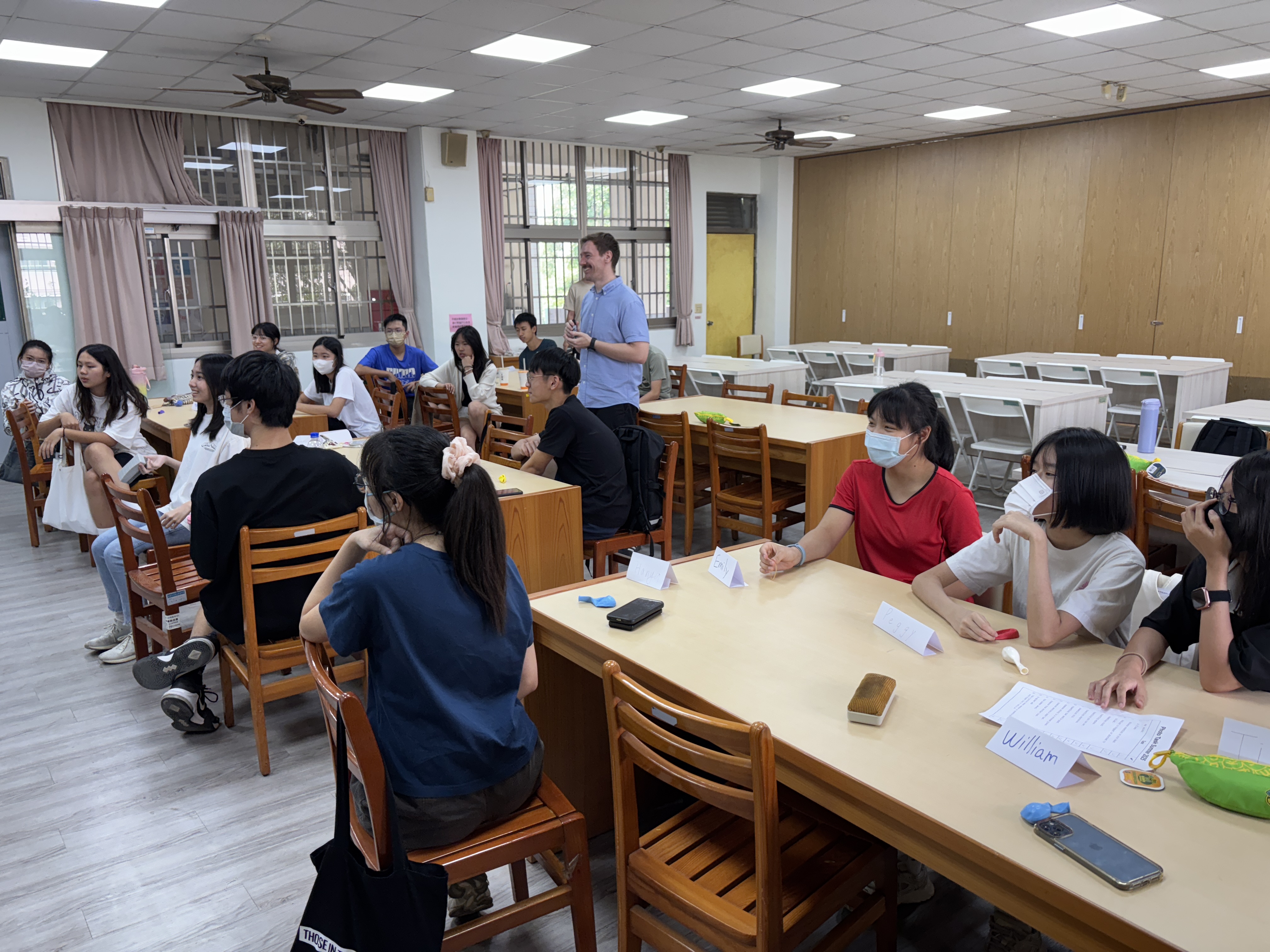 - 今天活動玩的很開心,steve老師安排的遊戲都很有趣不會無聊,而且玩了這麼多遊戲也增進了同學之間彼此的感情,早上的任務大師,下午自己玩每組出的任務,在課堂中充滿了許多歡笑,希望未來還有這種好玩的團康活動,可以一邊學習英文一邊享受遊戲帶來的樂趣。